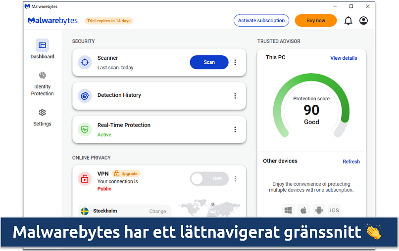 Malwarebytes antivirus- och VPN-skydd är exklusivt för deras premiumpaket, som täcker upp till 20 enheter. Du kan tryggt prova Malwarebytes med deras generösa 60 dagars pengarna tillbaka-garanti.