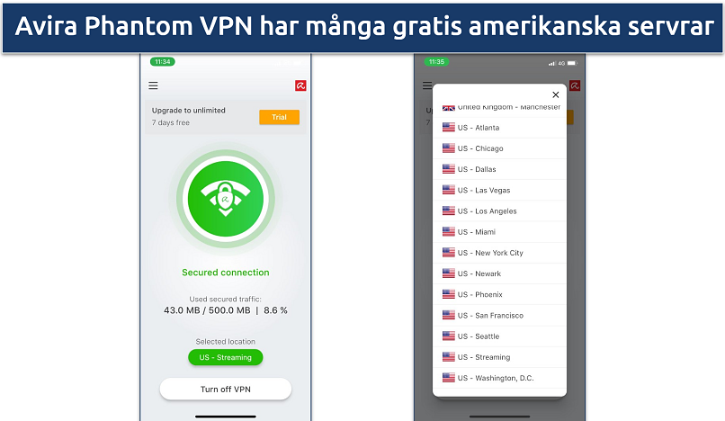 Avira Phantom VPNs gratis mobilapp erbjuder många gratisservrar, inklusive en i USA som är streamingoptimerad. Även om det inte fungerar med många populära plattformar kan deras tjänst åtminstone komma åt en del amerikanskt innehåll, som Disney+, Crackle, Peacock och Netflix Originals-program i bra kvalitet. Flera anslutningar hjälper också till att förhindra överbelastade servrar. Medan vi testade deras servrar gav Avira Phantom VPN oss stabila anslutningar.