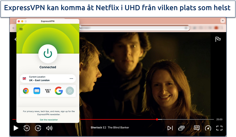 ExpressVPN är den snabbaste VPN vi testade för streaming. Deras Lightway-protokoll erbjuder snabba och säkra anslutningar samtidigt som du sparar enhetens batteri. Från Storbritannien anslöt jag mig till den närliggande Docklands-servern och upplevde endast en hastighetsminskning på 1%, vilket är hur bra som helst. Jag kunde streama mitt lokala Netflix i 4K utan avbrott.