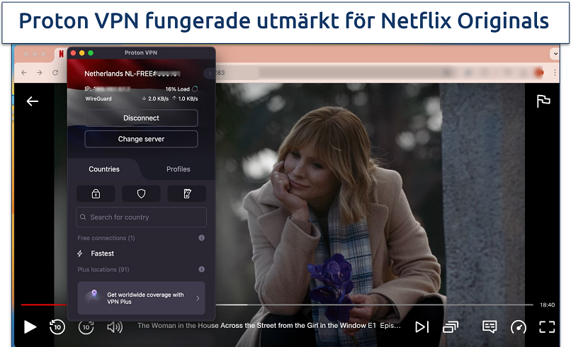 Proton VPN erbjuder fantastiska hastigheter för en gratistjänst. Under våra tester med Proton VPN laddades streamingplattformar snabbt och bildkvaliteten var konsekvent bra. Min kollega från Amsterdam registrerade endast en hastighetsminskning på 8% på sin lokala server. Det gjorde att de kunde streama Kvinnan i huset på andra sidan gatan utan lagg.