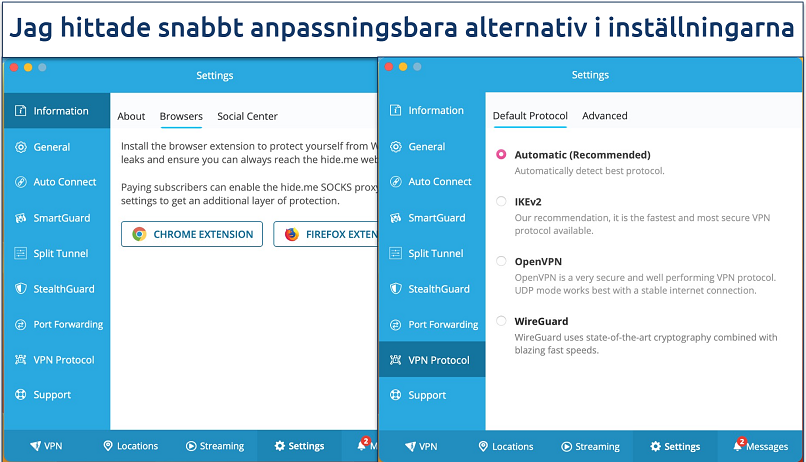 Det finns också många anpassningsalternativ för att förbättra dina streaminganslutningar. Till exempel erbjuder de även i sin gratisversion det hastighetsoptimerade WireGuard-protokollet, vilket gav mig de bästa hastigheterna för streaming. De har också automatiskt anslutning, ”Auto Connect”, som automatiskt ansluter din VPN när du ansluter till ett offentligt WiFi för att säkerställa att din data är säker.